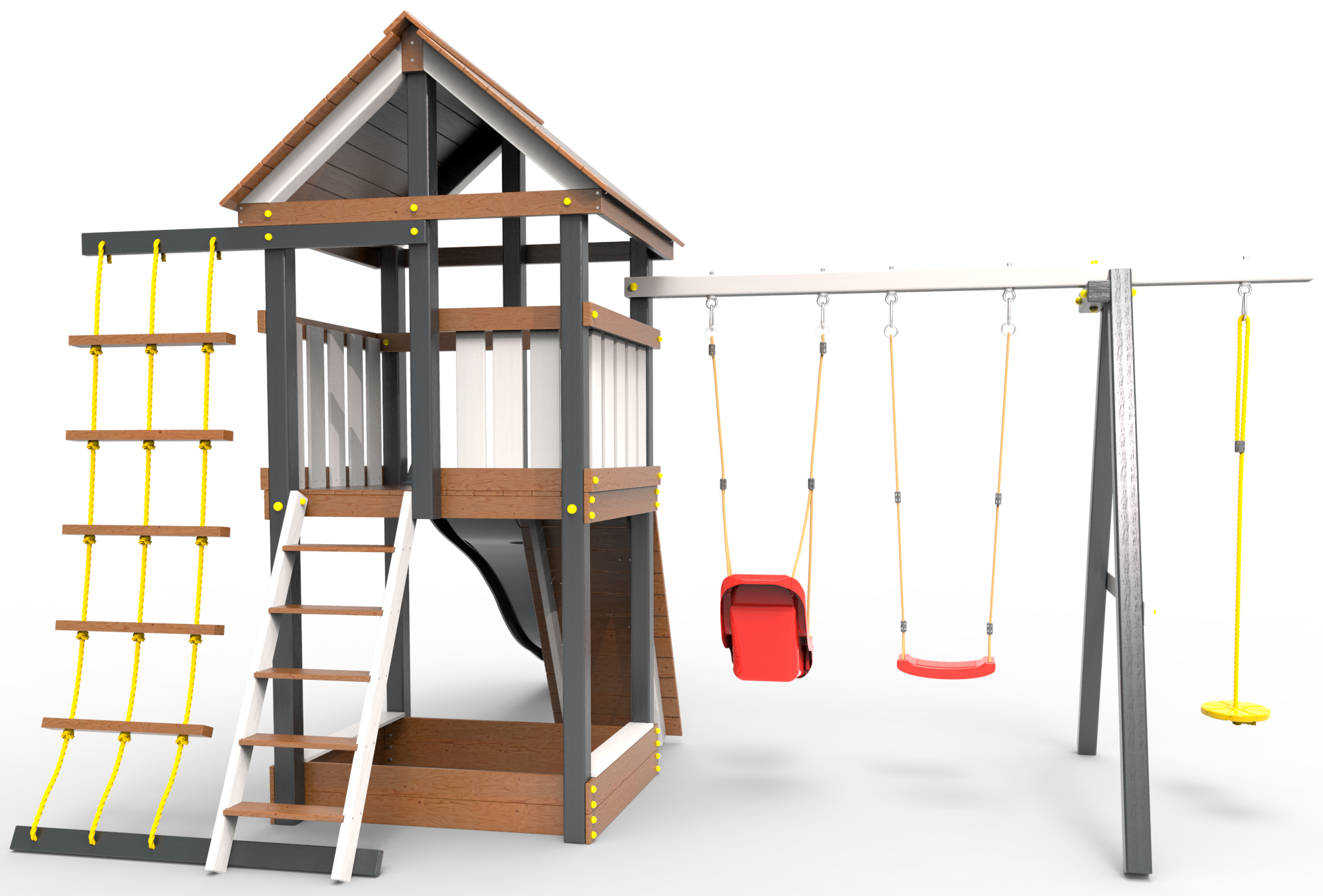 Комплектация модели выполняется по вашему желанию. Древесина пропитана высококачественными экологичными материалами (антисептиками), и покрашена..