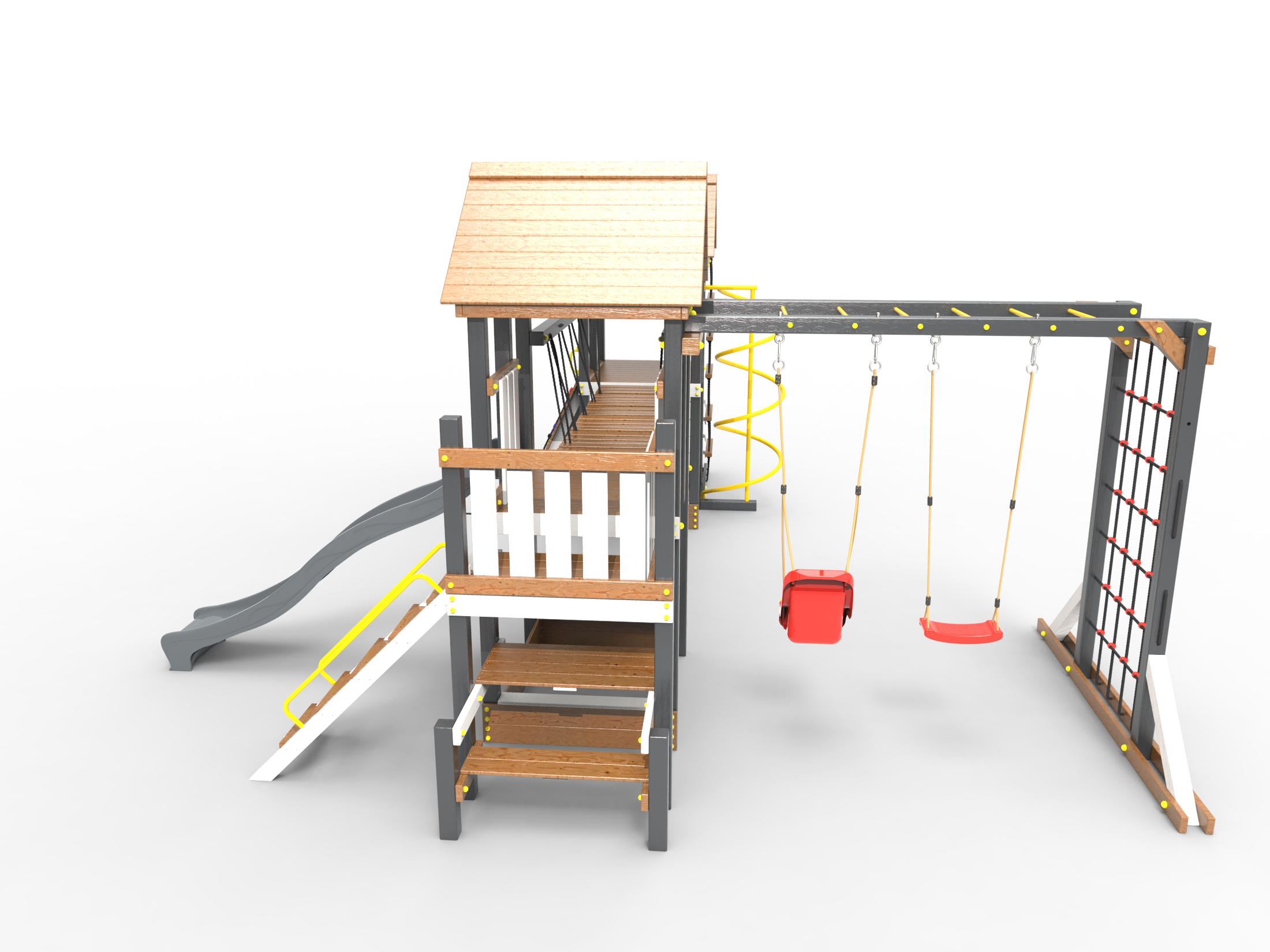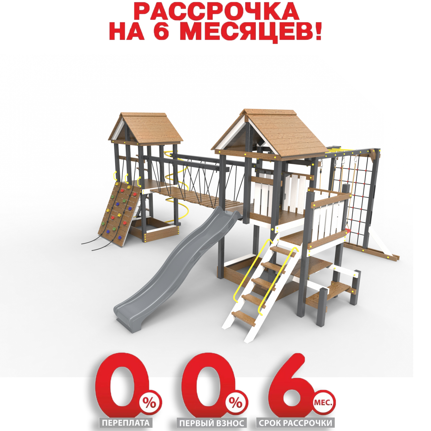 Обращаем Ваше внимание, что фактический цвет детской площадки может отличаться от представленных фото на сайте. Специфика окраски нетоксичными пропитками и красителями допускает отклонения в цветовой гамме отгружаемых изделий. Также обратите внимание, что фактический цвет может отличаться из-за цветопередачи устройства на котором Вы смотрите фото. Производитель оставляет за собой право менять цвет отдельных деталей и комплектующих(включая пластик, канаты и пр.), при этом сохраняя весь функционал и характеристики товара.
