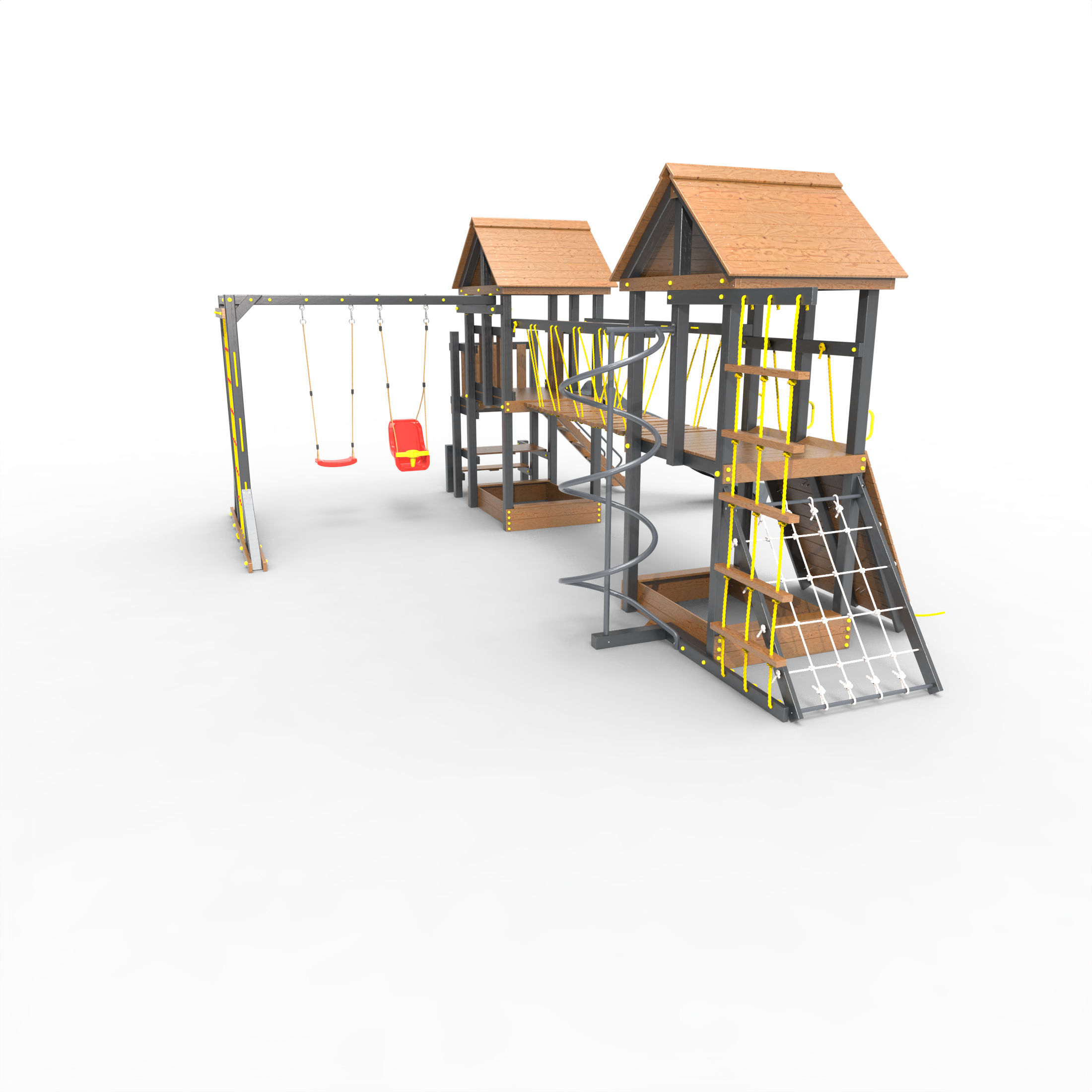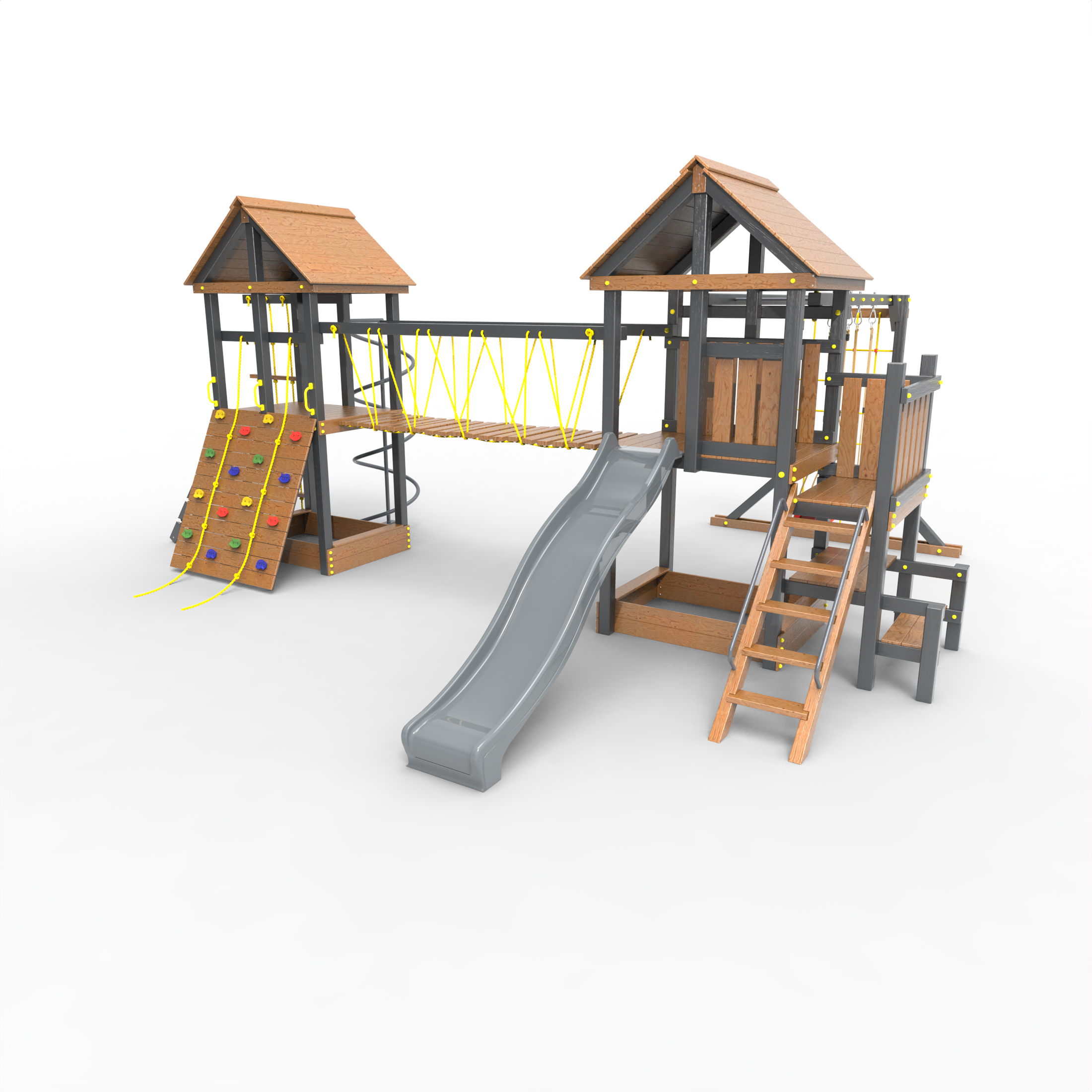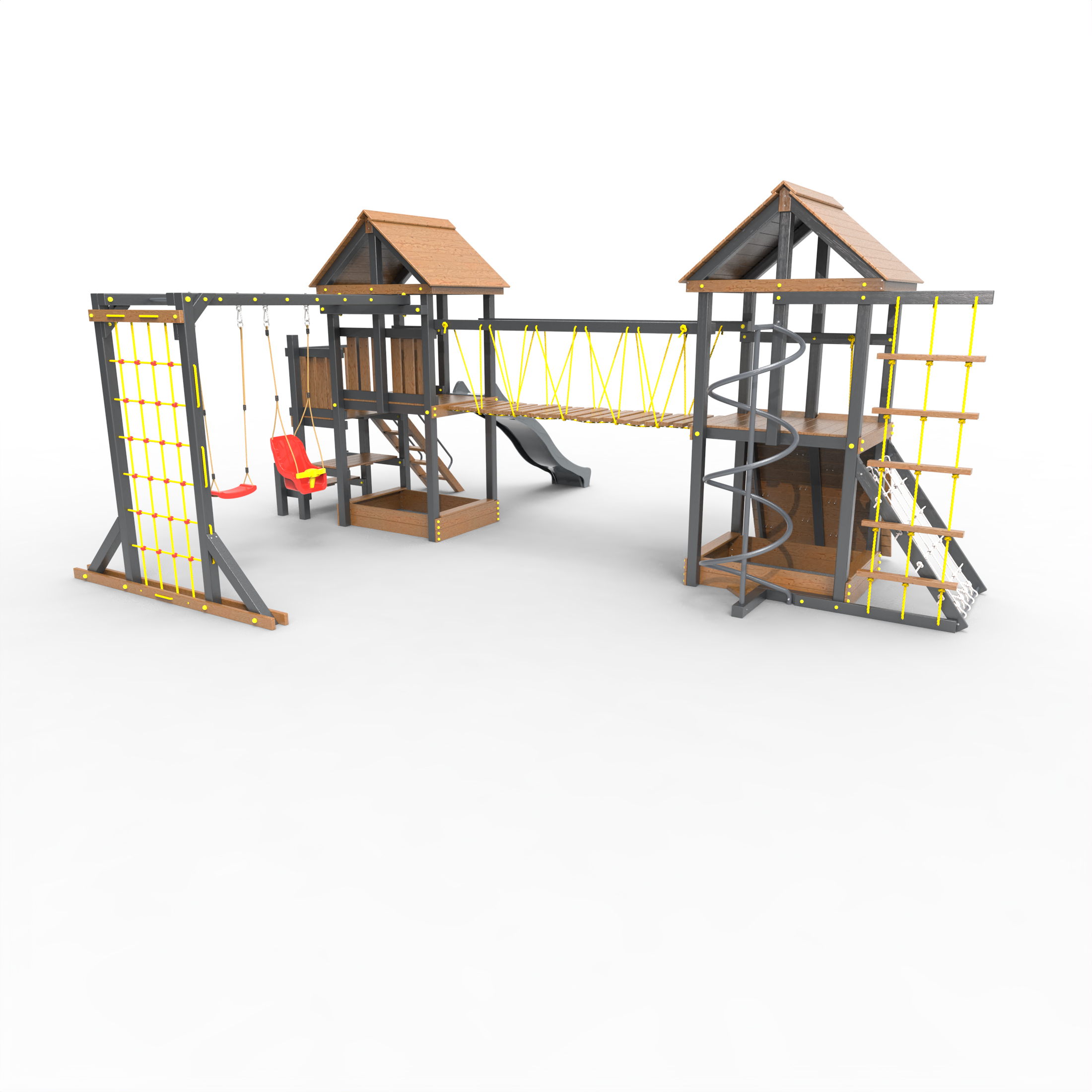 Обращаем Ваше внимание, что фактический цвет детской площадки может отличаться от представленных фото на сайте. Специфика окраски нетоксичными пропитками и красителями допускает отклонения в цветовой гамме отгружаемых изделий. Также обратите внимание, что фактический цвет может отличаться из-за цветопередачи устройства на котором Вы смотрите фото. Производитель оставляет за собой право менять цвет отдельных деталей и комплектующих(включая пластик, канаты и пр.), при этом сохраняя весь функционал и характеристики товара.